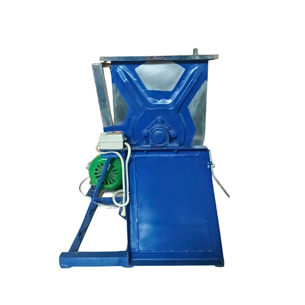 4. Setelah proses pencampuran selesai, matikan mesin dan tunggu sampai mesin matii. Keluarkan hasil adukan bubuk secara perlahan supaya tidak tumpah. Gunakan wadah yang bersih untuk menampung hasil olahan dari mesin bubuk ini.